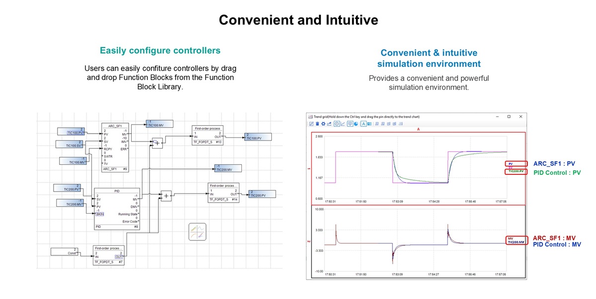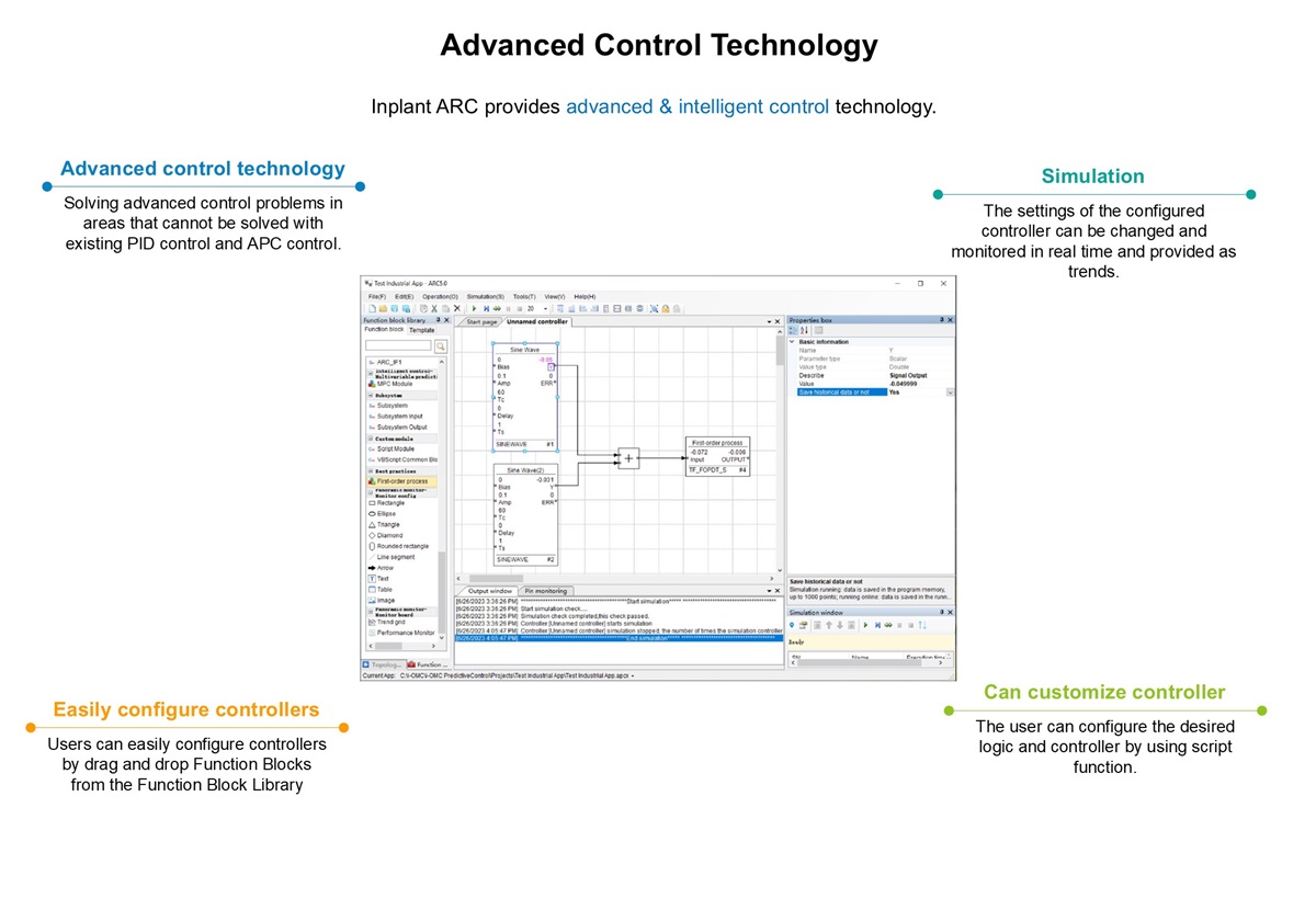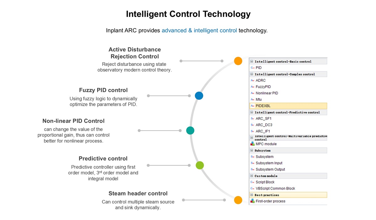 1. Advanced Control Technology Inplant ARC provides advanced & intelligent control technology. Advanced control technology : Solving advanced control problems in areas that cannot be solved with existing PID control and APC control. Easily configure controllers : Users can easily configure controllers by drag and drop Function Blocks from the Function Block Library. Simulation : The settings of the configured controller can be changed and monitored in real time and provided as trends. Can customize controller : The user can configure the desired logic and controller by using script function. 2.Intelligent Control Technology Inplant ARC provides advanced & intelligent control technology. Active Disturbance Rejection Control : Reject disturbance using state observatory modern control theory. Fuzzy PID control : Using fuzzy logic to dynamically optimize the parameters of PID. Non-linear PID Control : can change the value of the proportional gain, thus can control better for nonlinear process. Predictive control : Predictive controller using first order model, 3rd order model and integral model Steam header control : Can control multiple steam source and sink dynamically. 3. Convenient and Intuitive Easily configure controllers : Users can easily confiture controllers by drag and drop Function Blocks from the Function Block Library. Convenient & intuitive simulation environment : Provides a convenient and powerful simulation environment.