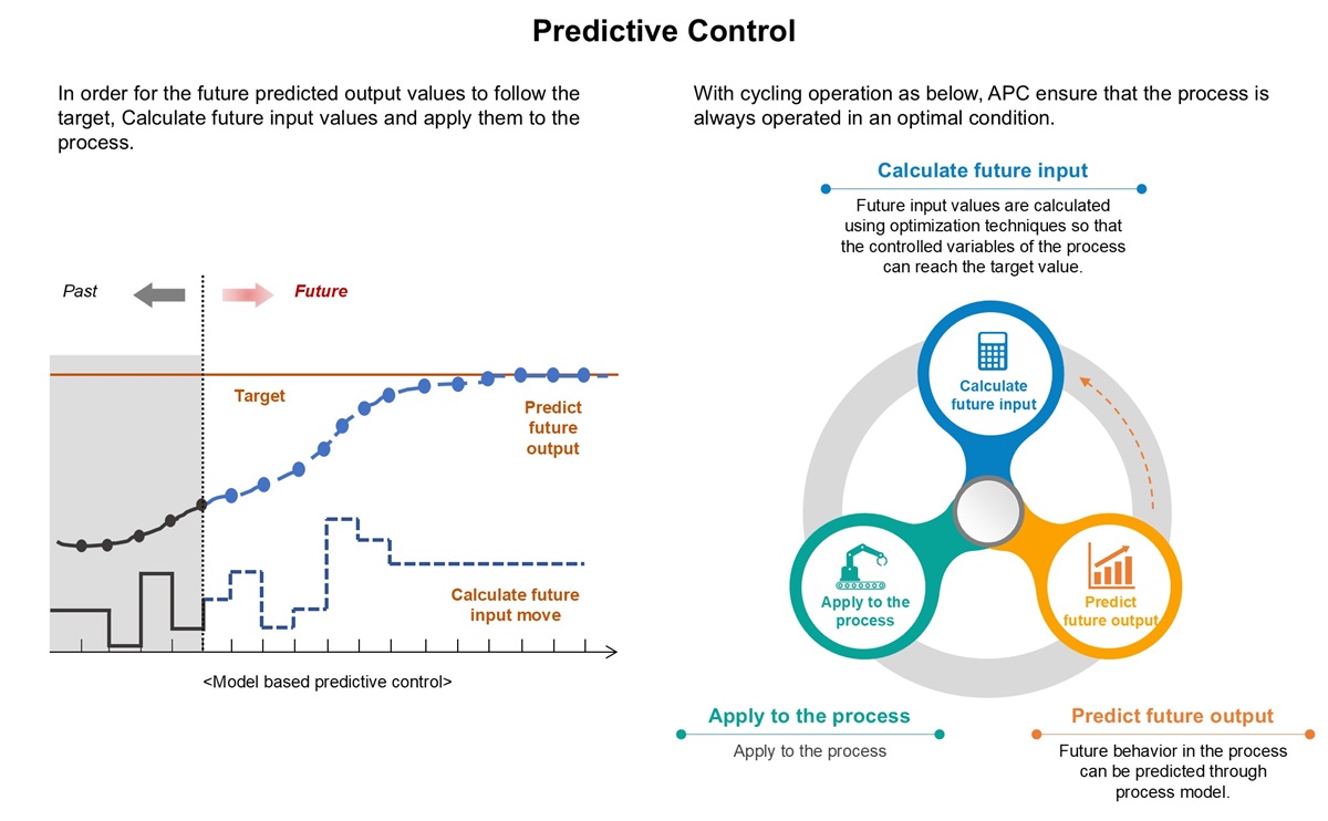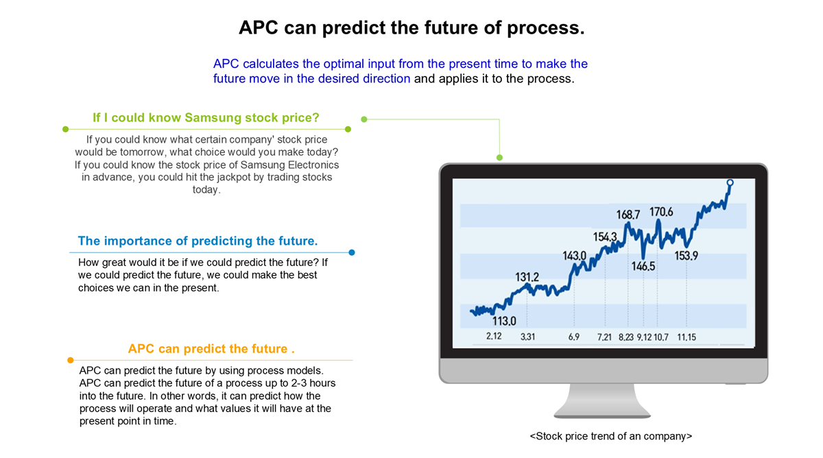 APC calculates the optimal input from the present time to make the future move in the desired direction and applies it to the process.