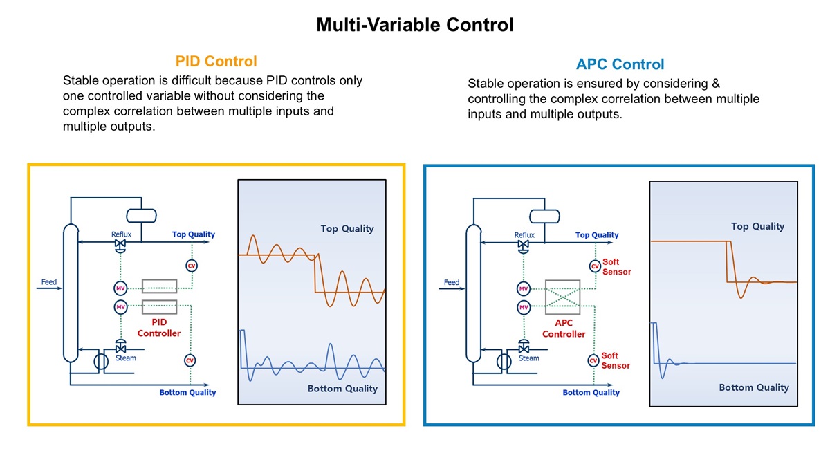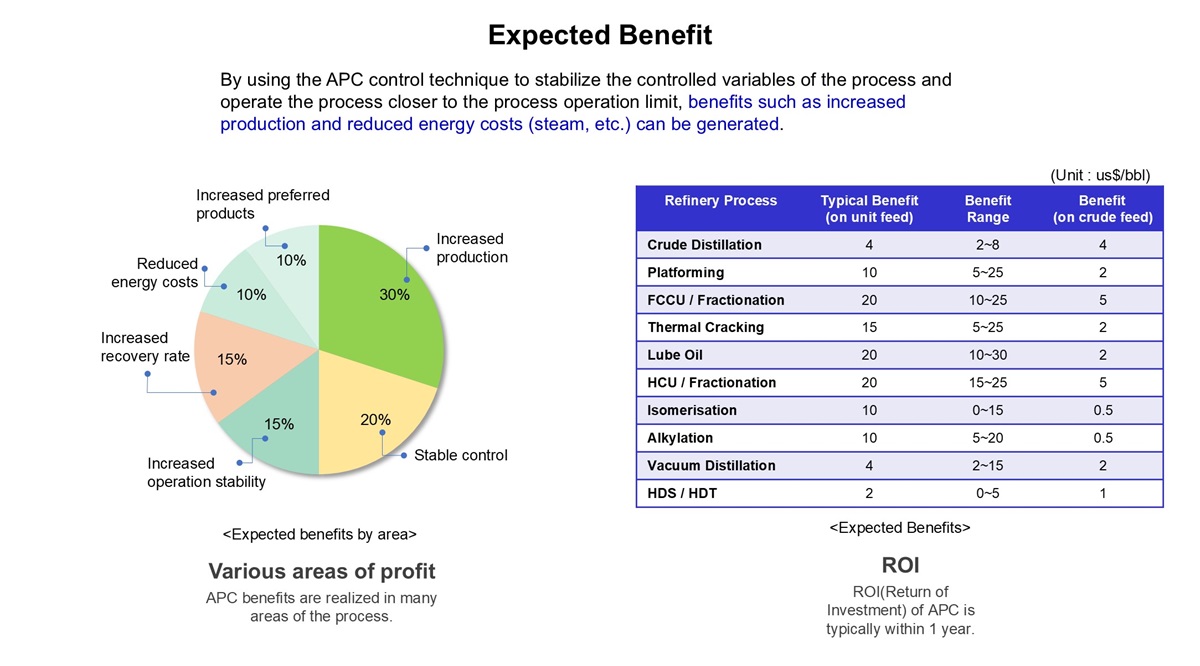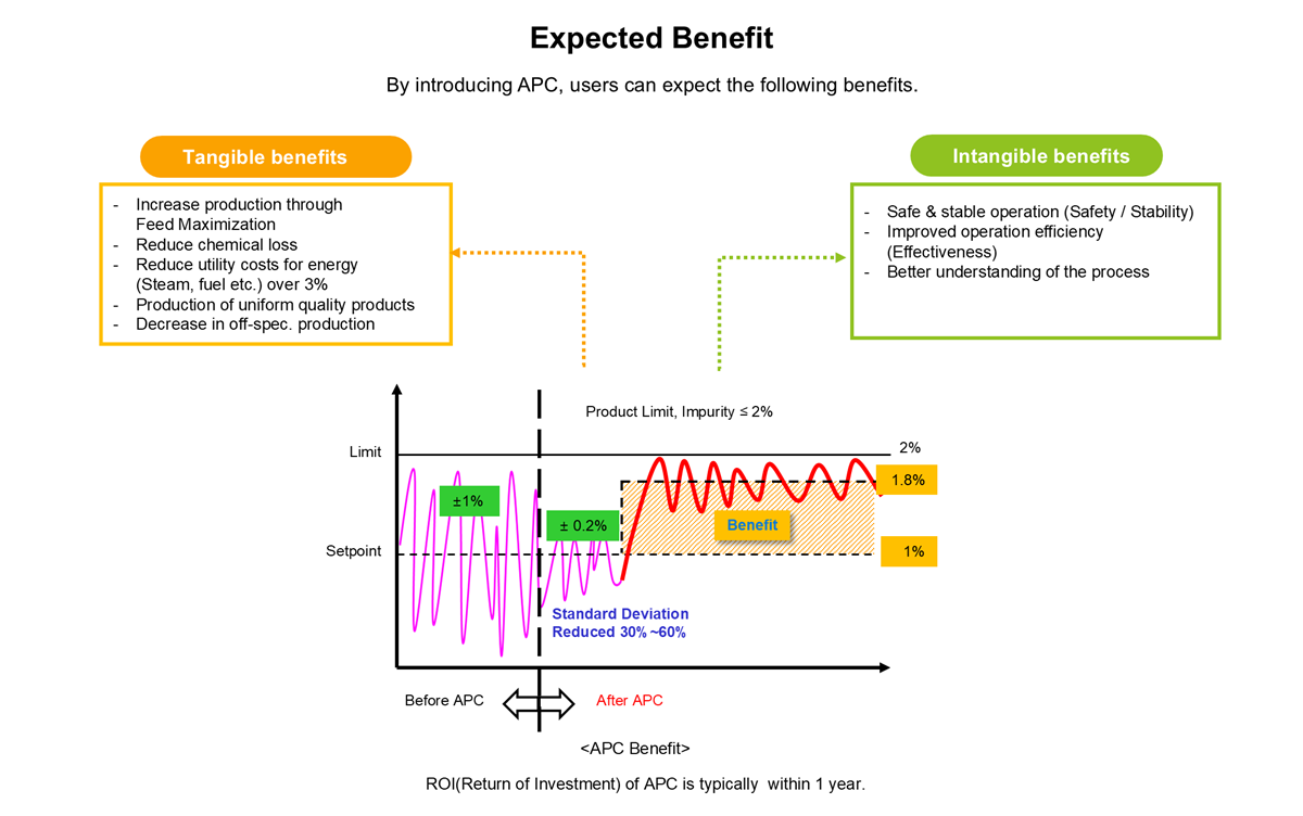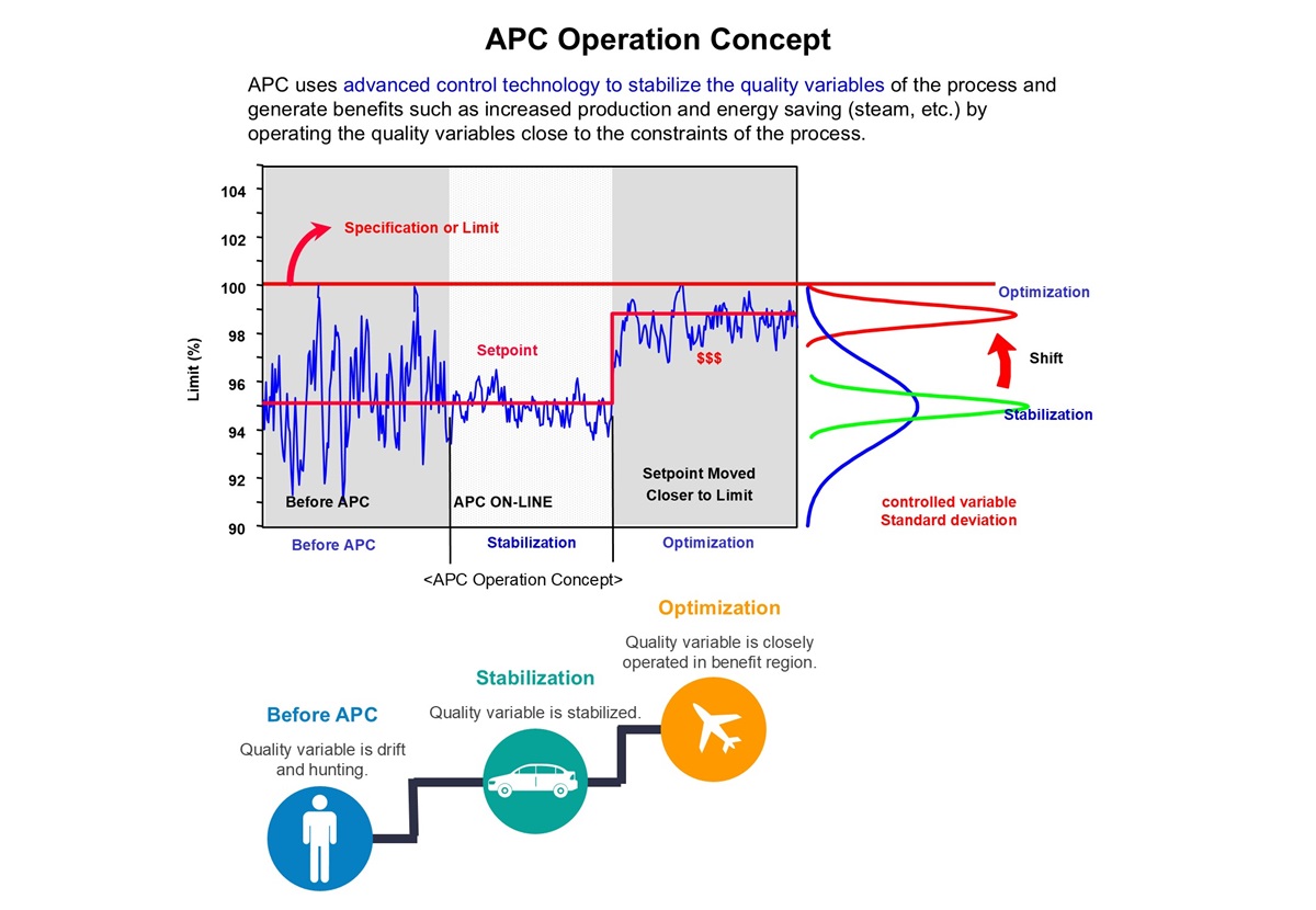 APC uses advanced control technology to stabilize the quality variables of the process and generate benefits such as increased production and energy saving (steam, etc.) by operating the quality variables close to the constraints of the process.