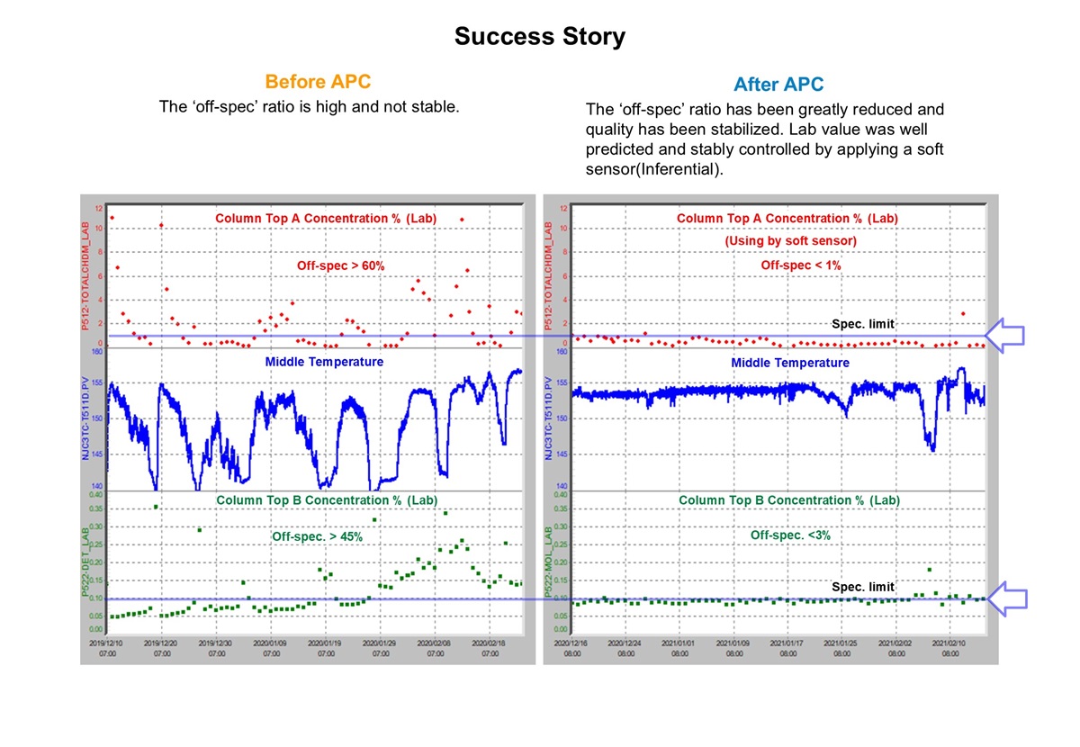 The ¡®off-spec¡¯ ratio has been greatly reduced and quality has been stabilized. Lab value was well predicted and stably controlled by applying a soft sensor(Inferential). (ÇѱÛ)